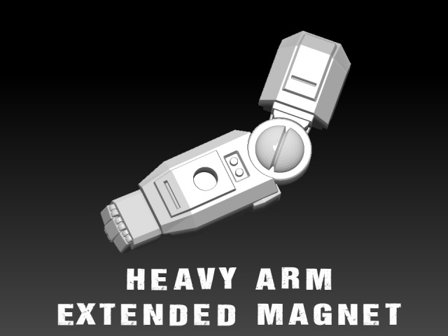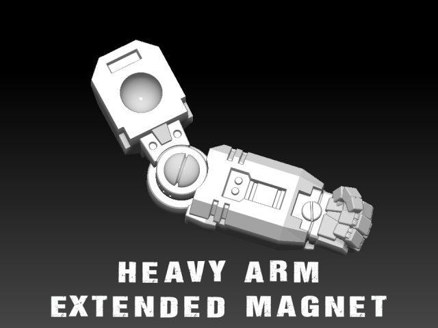 Pair of Heavy Arms (1 Left arm 1 Right Arm). Adjustable elbow joint with option for a weapon slot or pre-set magnet hole. (3x2mm round)